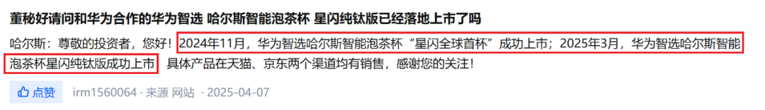 2025年4月,哈尔斯在互动易上表示,2024年11月,华为智选哈尔斯智能泡茶杯“星闪全球首杯”成功上市;2025年3月,华为智选哈尔斯智能泡茶杯星闪纯钛版成功上市,具体产品在天猫、京东两个渠道均有销售。