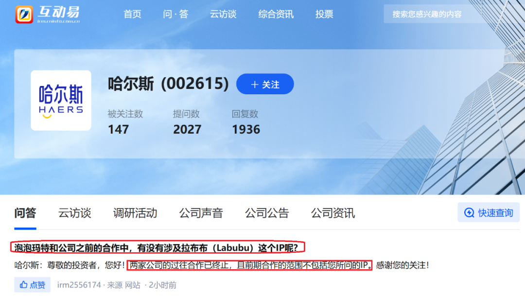 三连板牛股哈尔斯(002615)突然否认了和泡泡玛特的合作。